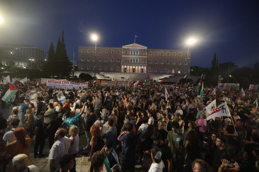 Στην Αθήνα η συγκέντρωση ξεκίνησε στις 8 μ.μ. με πλήθος πολιτών να φωνάζουν δυνατά συνθήματα υπέρ του παλαιστινιακού λαού.