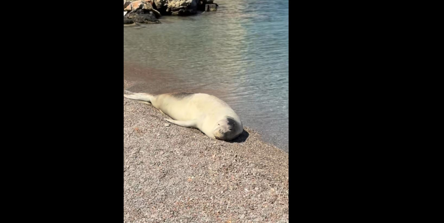Στο όμορφο βίντεο του Symi TV, το θαλάσσιο θηλαστικό φαίνεται να χαλαρώνει ανενόχλητο στην ακτή, απολαμβάνοντας τον ήλιο και την ζέστη.
