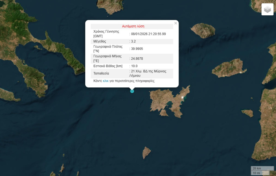 Σεισμός μεγέθους 3,2 ρίχτερ σημειώθηκε στη Λήμνο. Η δόνηση έγινε στις 23:20 και είχε επίκεντρο 21χλμ. ΒΔ της Μύρινας Λήμνου.