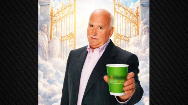 Στην επίμαχη εικόνα που αναρτήθηκε στα μέσα κοινωνικής δικτύωσης, ο γνωστός δημοσιογράφος απεικονίζεται να βρίσκεται στις πύλες του παραδείσου, κρατώντας καφέ από το συγκεκριμένο κατάστημα.