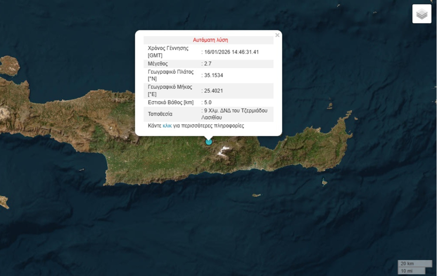 Σεισμός σημειώθηκε στο Λασίθι νωρίς το απόγευμα της Παρασκευής.