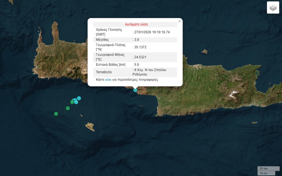 Σεισμός σημειώθηκε στο Ρέθυμνο το βράδυ της Τρίτης.