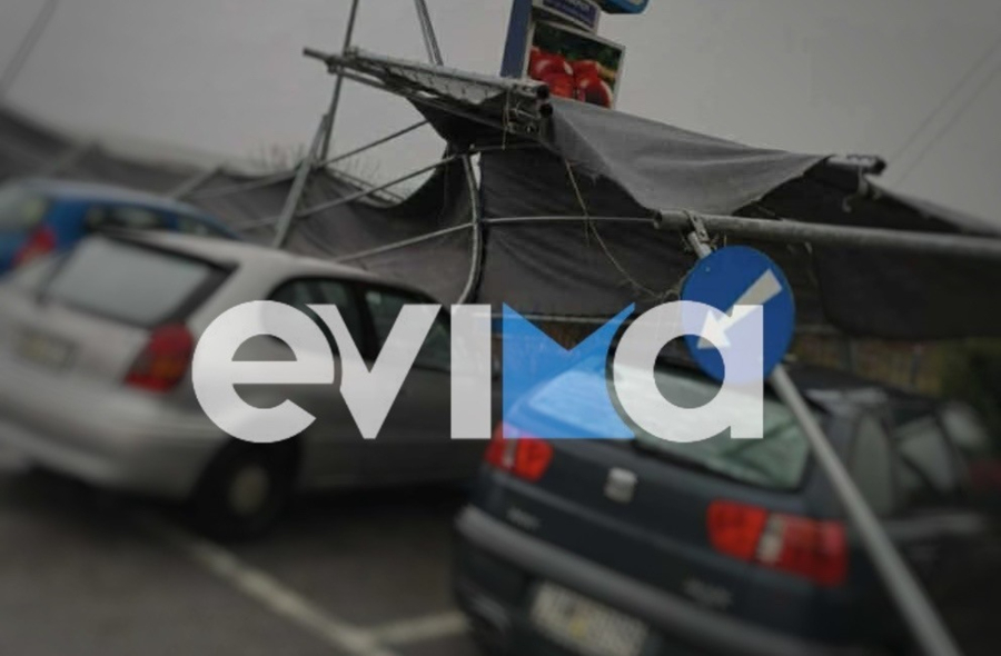 Τα στέγαστρα έπεσαν πάνω σε κολώνα φωτισμού, που έχει πάρει κλίση προς τον δρόμο και στο σημείο έσπευσαν δυνάμεις της Πυροσβεστικής και της Αστυνομίας.