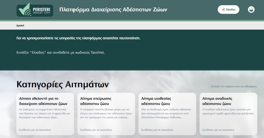 Σε λειτουργία θέτει ο δήμος Περιστερίου νέα ψηφιακή πλατφόρμα για την προστασία και τη διαχείριση των αδέσποτων ζώων συντροφιάς, διευκολύνοντας σημαντικά την εξυπηρέτηση των πολιτών. Η πλατφόρμα adespota.peristeri.gr δίνει τη δυνατότητα ηλεκτρονικής υποβολής όλων των αιτήσεων που προβλέπει η ισχύουσα νομοθεσία, από αιτήματα για στείρωση και περίθαλψη έως υιοθεσία, αναδοχή, εθελοντισμό, δήλωση δεσποζόμενου ζώου, δήλωση απώλειας και άλλες συναφείς διαδικασίες, με απλό και λειτουργικό τρόπο.