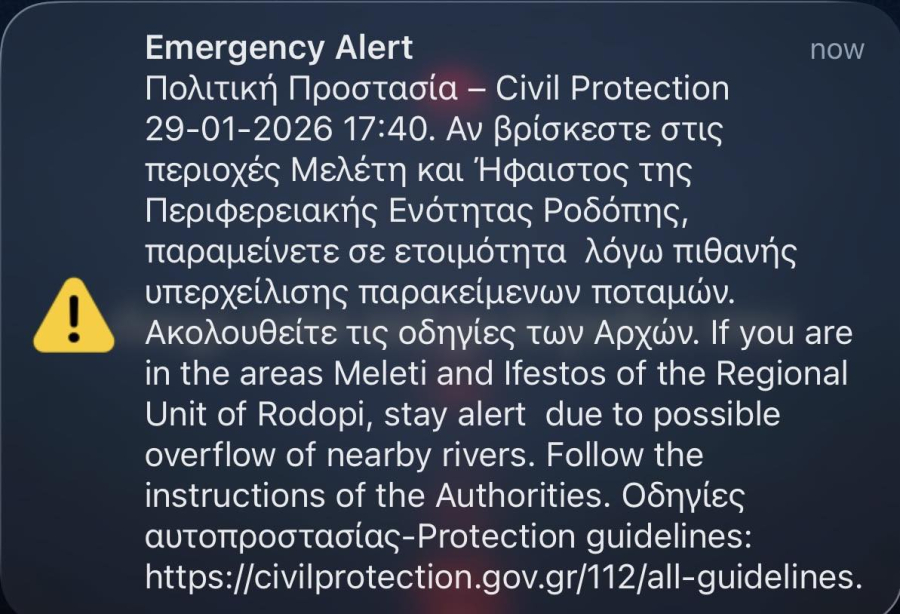 Ειδικότερα στο μήνυμα που στάλθηκε στα κινητών των κατοίκων έγραφε «Αν βρίσκεστε στις περιοχές #Μελέτη και #Ήφαιστος της Περιφερειακής Ενότητας #Ροδόπης παραμείνετε σε ετοιμότητα λόγω πιθανής υπερχείλισης παρακείμενων ποταμών».