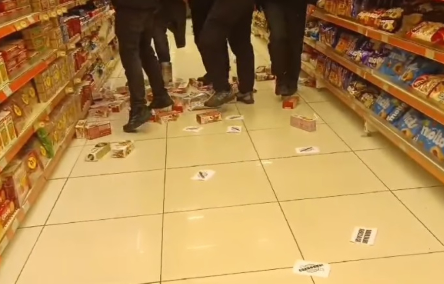Αναστάτωση προκλήθηκε χθες σε κεντρικό σούπερ μάρκετ του Βόλου, όταν ομάδα νεαρών ντυμένων στα μαύρα εισέβαλε στον χώρο, πέταξε τρικάκια, φώναξε συνθήματα και πέταξε από τα ράφια μπισκότα «Βιολάντα», τα οποία ποδοπάτησε.