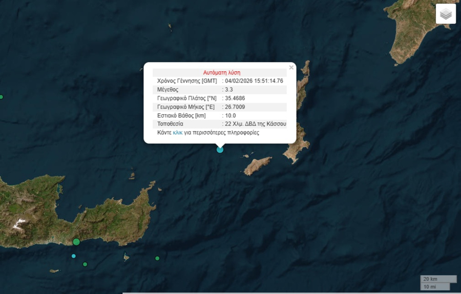 Στις 17:51 καταγράφηκε δόνηση μεγέθους 3,3 Ρίχτερ, αναφέρει η αυτόματη λύση του Γεωδυναμικού Ινστιτούτου.