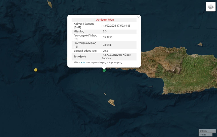 Το επίκεντρο του σεισμού εντοπίστηκε 13 χιλιόμετρα δυτικά- νοτιοδυτικά της Χώρας Σφακίων και το εστιακό βάθος ήταν 29,2 χλμ., σύμφωνα με τις αρχικές πληροφορίες.