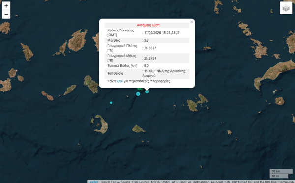 Πρόκειται για δόνηση 3,3 Ρίχτερ, σύμφωνα με την αυτόματη λύση του Γεωδυναμικού Ινστιτούτου, η οποία καταγράφηκε στις 17:23.