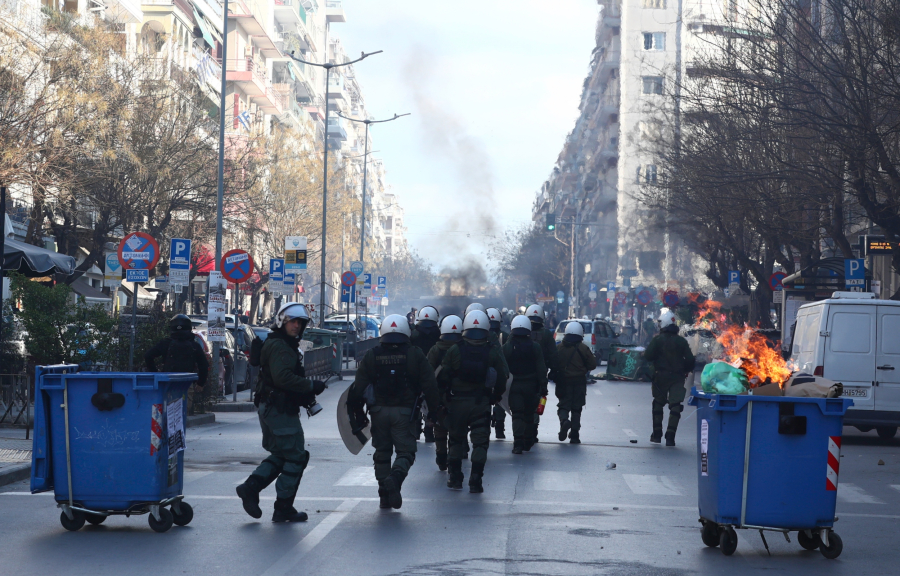 Μία από τις υποομάδες αναποδογύρισε κάδους στην οδό Εγνατία για να δημιουργήσει οδοφράγματα, με αποτέλεσμα οι αστυνομικοί να προχωρήσουν σε απώθηση και τα άτομα τελικά να αποχωρήσουν προς διάφορες κατευθύνσεις.
