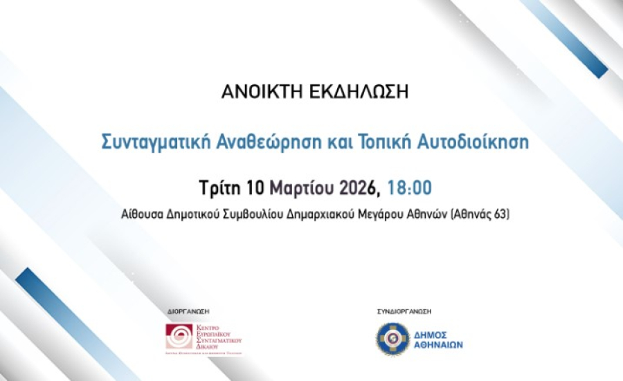 Το Κέντρο Ευρωπαϊκού Συνταγματικού Δικαίου – Ίδρυμα Θεμιστοκλή & Δημήτρη Τσάτσου και ο Δήμος Αθηναίων σας προσκαλούν στην ανοικτή εκδήλωση με θέμα «Συνταγματική Αναθεώρηση και Τοπική Αυτοδιοίκηση».