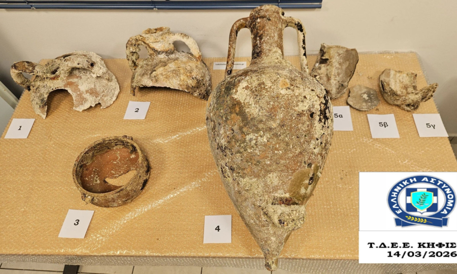 Πιο συγκεκριμένα, σε έρευνα που πραγματοποιήθηκε στο σπίτι του 50χρονου εντοπίστηκαν 10 τμήματα ενάλιων αμφορέων. Πρόκειται για τέσσερεις ενάλιους αμφορείς από την Ελληνιστική περίοδο, τέσσερα τμήματα από τη Βυζαντινή και δύο από τη Νεότερη περίοδο.