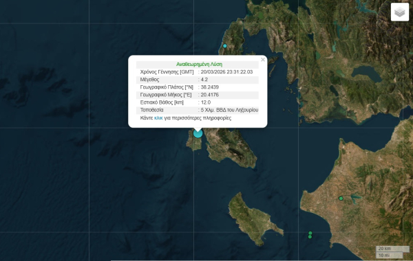 Σεισμός μεγέθους 4,2 ρίχτερ σημειώθηκε στην Κεφαλονιά με επίκεντρο 5 Χλμ. ΒΒΔ του Ληξουρίου.
