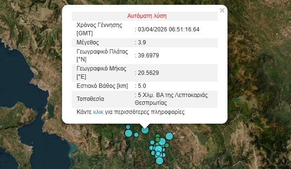 Σεισμός 3,9 Ρίχτερ σημειώθηκε πριν από λίγο στη Θεσπρωτία.