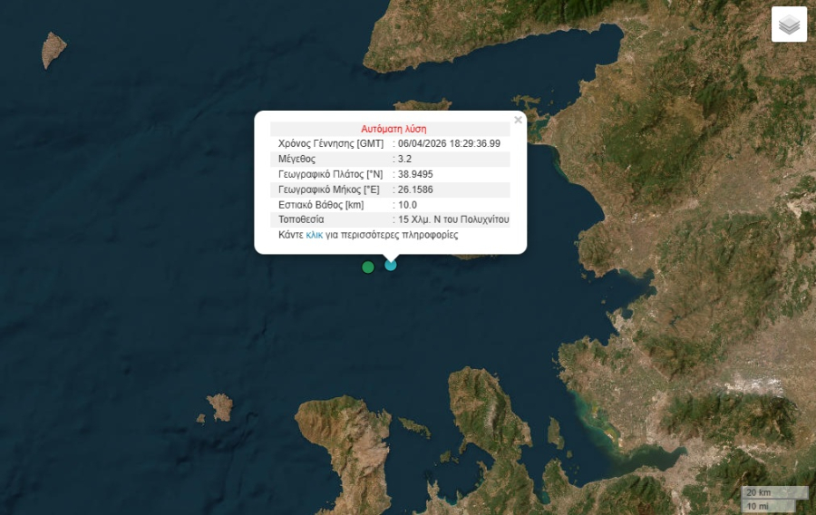 Σεισμός μεγέθους 3,2 ρίχτερ στη Μυτιλήνη. Η δόνηση έγινε στις 21:29 και είχε επίκεντρο 15χλμ. νότια του Πολυχνίτου.