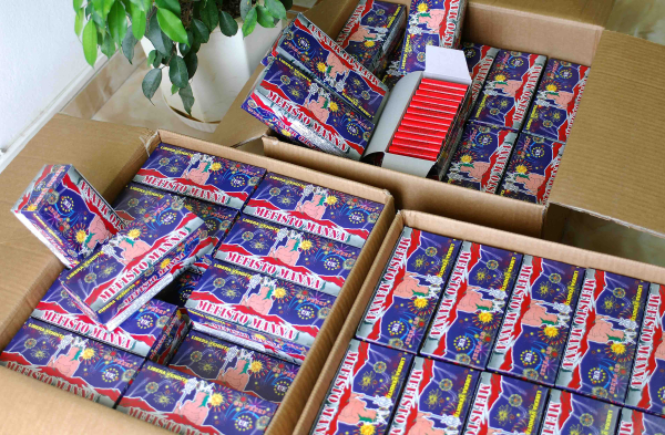 Εκεί εντοπίστηκε μεγάλη ποσότητα πυροτεχνικών, μεταξύ των οποίων 1.159 κροτίδες, 700 φωτοβολίδες, 100 βεγγαλικά, πέντε πιστόλια εκτόξευσης φωτοβολίδων και 11.800 μεταλλικά καψύλλια, καθώς και χρηματικά ποσά ύψους 9.232 ευρώ και 149.000 λεκ Αλβανίας.