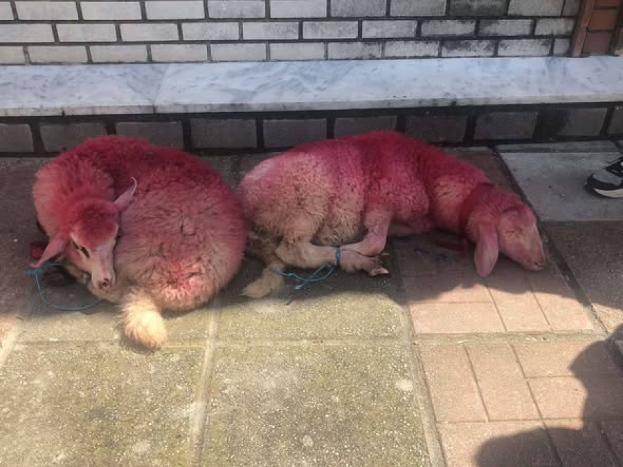 Σύμφωνα με καταγγελία του φιλοζωικού πολιτιστικού σωματείου «Άριελ», τα δύο πρόβατα είναι βαμμένα κόκκινα και δεμένα χειροπόδαρα. Τα δύο ζώα φαίνεται να είναι μέρος λαχειοφόρου αγοράς σε τοπική εκκλησία για τον εορτασμό του Αγ.Γεωργίου.