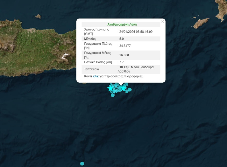 Σύμφωνα με την αναθεωρημένη λύση από το Γεωδυναμικό Ινστιτούτο σεισμική δόνηση μεγέθους 5 της Κλίμακας Ρίχτερ στην περιοχή του Λασιθίου.