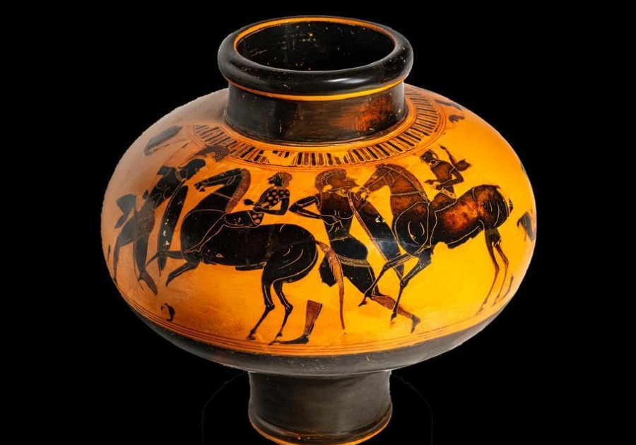 Αττικός μελανόμορφος ψυκτήρας (αγγείο που χρησιμοποιούταν για την ψύξη του κρασιού) με παράσταση ιππέων και οπλιτών. Ύψος 25,4 εκ. Γύρω στα 550 π.Χ. - ΥΠΠΟ