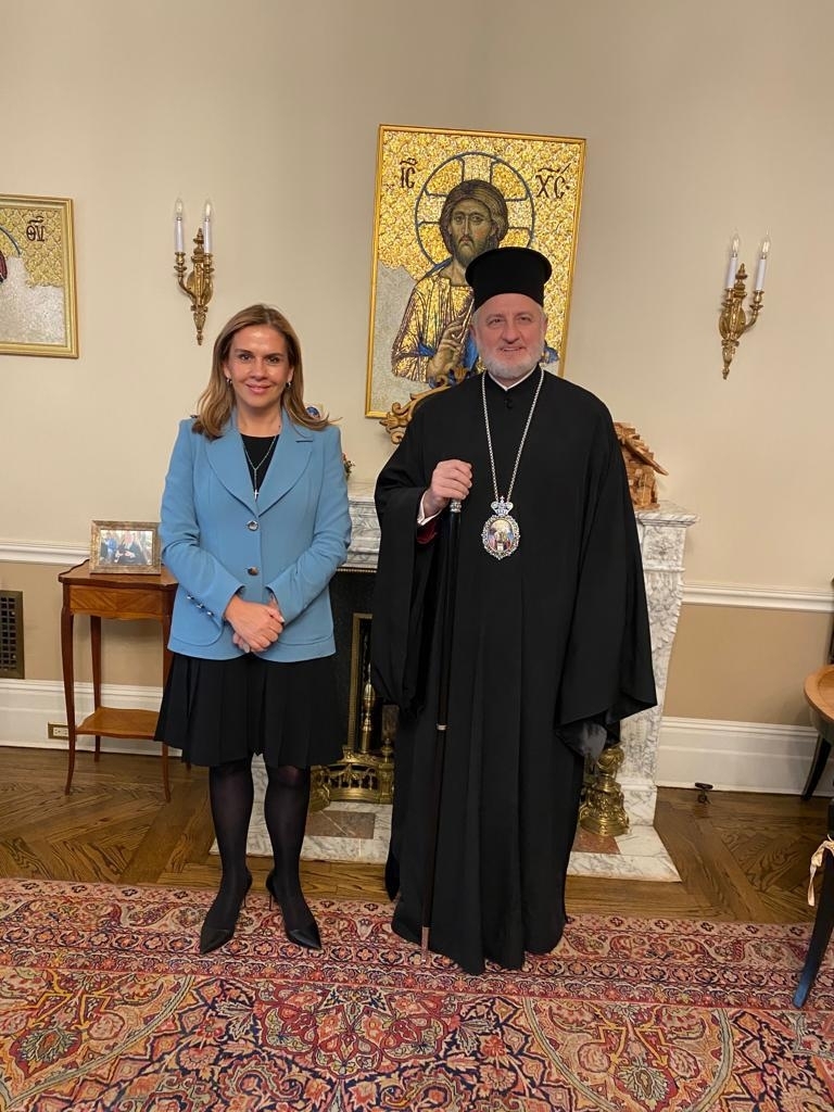 Στο πλαίσιο της επίσκεψής της, η Υφυπουργός Υγείας είχε την τιμή να συναντηθεί με τον Σεβασμιότατο Αρχιεπίσκοπο Αμερικής κ. Ελπιδοφόρο στην έδρα της Αρχιεπισκοπής, όπου συζήτησαν για την συνεισφορά της Εκκλησίας στον ελληνισμό της Διασποράς, τη στήριξή της στην εμβολιαστική εκστρατεία και τις δράσεις της στον τομέα της Ψυχικής Υγείας.
