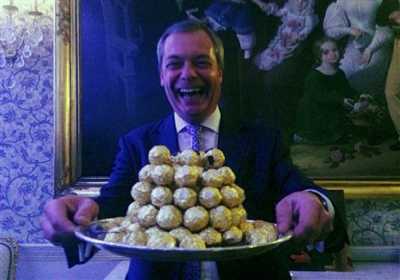 Πάντως σε ένα πάρτυ που έγινε στο ξενοδοχείο Ritz του Λονδίνου, ο Φάρατζ έγινε δεκτός με επευφημίες από τους παρισταμένους χρηματοδότες του όταν εμφανίστηκε με έναν δίσκο με πυραμίδα Ferrero Rocher.