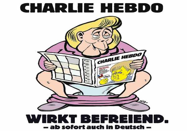 Αυτή είναι η αφίσα που επελέγη από τους ιθύνοντες ενόψει της κυκλοφορίας την Πέμπτη της γερμανόφωνης έκδοσης της εφημερίδας, στην πρώτη εκδοτική απόπειρα εκτός των συνόρων της Γαλλίας.
