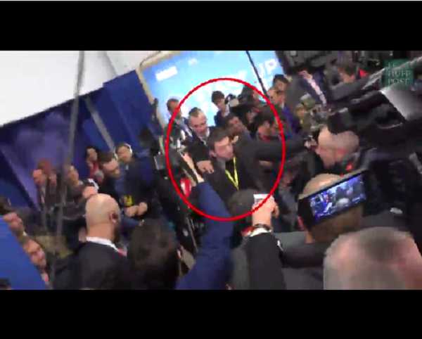 Ο δημοσιογράφος προσπαθεί να πλησιάσει την Λεπέν για να της πάρει μια δήλωση και τόσε οι σωματοφύλακές της στον σπρώχνουν βίαια.