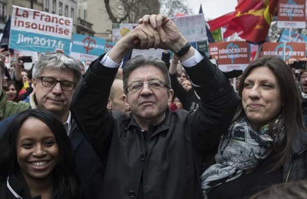 Μιλώντας κάτω από το γιγάντιο μπρούτζινο άγαλμα της Δημοκρατίας, ο Ζαν-Λικ Μελανσόν ενθουσίασε το συγκεντρωμένο πλήθος με τη ρητορική του.