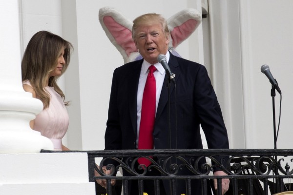 Έχοντας τον γιο της Μπάρον στα δεξιά της και τον σύζυγό της Ντόναλντ στα αριστερά, η Μελάνια δίνει το εναρκτήριο λάκτισμα των πασχαλινών εορτασμών από το μεγάλο ημικυκλικό μπαλκόνι που βλέπει στον κήπο του Λευκού Οίκου.