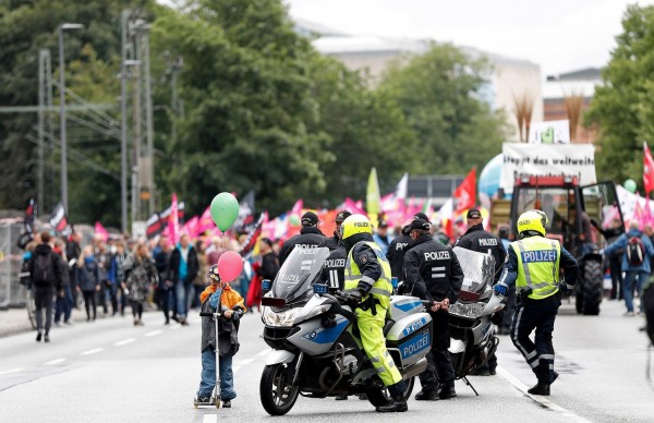Σε μάλλον οικογενειακή ατμόσφαιρα και κάτω από τη βροχή, οι διαδηλωτές συγκεντρώθηκαν αργά το πρωί μπροστά από το δημαρχείο του Αμβούργου όπου πολλοί πήραν τον λόγο για να ζητήσουν «μια άλλη πολιτική», να απευθύνουν έκκληση για σεβασμό του περιβάλλοντος ή να επικρίνουν τον αμερικανό πρόεδρο Ντόναλντ Τραμπ.