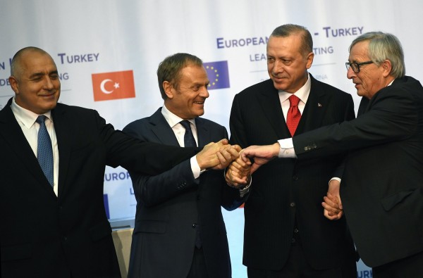 Ο Ερντογάν στην Βάρνα εμφανίστηκε αισιόδοξος. «Παραμένουμε χώρα υποψήφια προς ένταξη στην ΕΕ και επιθυμούμε να προχωρήσουμε ταχύτερα σε αυτή την κατεύθυνση», τόνισε ο αρχηγός του τουρκικού κράτους μετά το δείπνο εργασίας με τους προέδρους της Ευρωπαϊκής Επιτροπής Ζαν-Κλοντ Γιούνκερ και του Ευρωπαϊκού Συμβουλίου Ντόναλντ Τουσκ στη Βάρνα, στη Μαύρη Θάλασσα, που παρέθεσε η βουλγαρική προεδρία της ΕΕ.