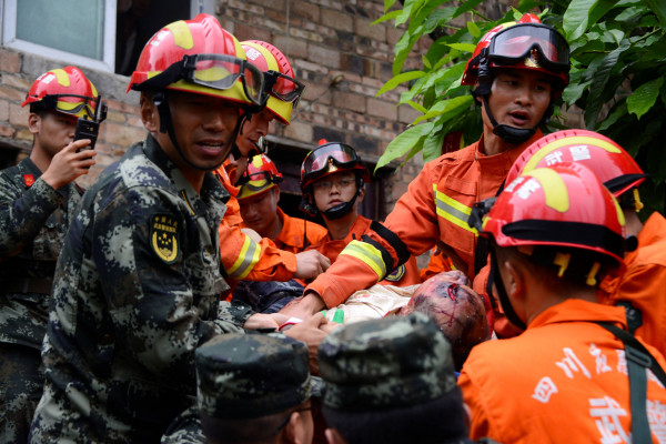 Πλάνα που μεταδόθηκαν από κινεζικά κρατικά τηλεοπτικά δίκτυα εικονίζουν σωστικά συνεργεία καθώς απομακρύνουν πάνω σε φορείο ένα θύμα που μπόρεσαν να ανασύρουν από τα συντρίμμια ενός κτιρίου.