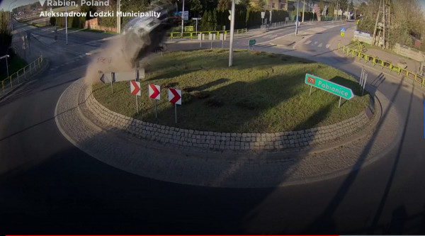 Στο βίντεο φαίνεται ένα αυτοκίνητο να φτάνει με μεγάλη ταχύτητα σε κυκλικό κόμβο, ο οδηγός να μην φρενάρει καν και τότε το αμάξι χτυπάει στο κράσπεδο και να ...«απογειώνεται».