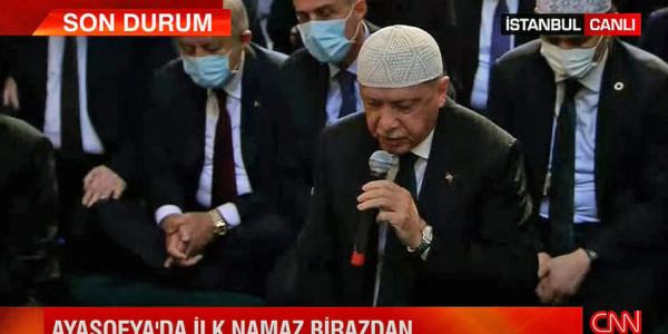 Ο Τούρκος πρόεδρος, φορώντας μάσκα, έφτασε στην Αγία Σοφία λίγο μετά τις 12 το μεσημέρι. Και αφού γονάτισε στα ειδικά χαλιά που έχουν τοποθετηθεί, προσευχήθηκε και ο ίδιος, ενώ όπως φάνηκε λίγο αργότερα κατά τη ζωντανή μετάδοση της πρώτης μουσουλμανικής προσευχής στην Αγία Σοφία έπειτα 86 χρόνια, ο Τούρκος πρόεδρος με το μικρόφωνο ανά χείρας διάβασε ένα απόσπασμα από το Κοράνι.