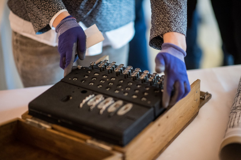 Ο ναζιστικός στρατός χρησιμοποιούσε αυτές τις μηχανές για να στέλνει και να λαμβάνει κρυπτογραφημένα μηνύματα κατά τη διάρκεια του Β΄ Παγκοσμίου Πολέμου. Δύο Βρετανοί κρυπτογράφοι έσπασαν τον κώδικα, βοηθώντας τους Συμμάχους να αποκτήσουν ένα πλεονέκτημα στη μάχη για τον έλεγχο του Ατλαντικού Ωκεανού. Η ομάδα των κρυπτογράφων του Μπλέτσλεϊ Παρκ, υπό τον Άλαν Τούρινγκ, πιστεύεται ότι βοήθησε να συντομευθεί ο πόλεμος και να σωθούν χιλιάδες ζωές.