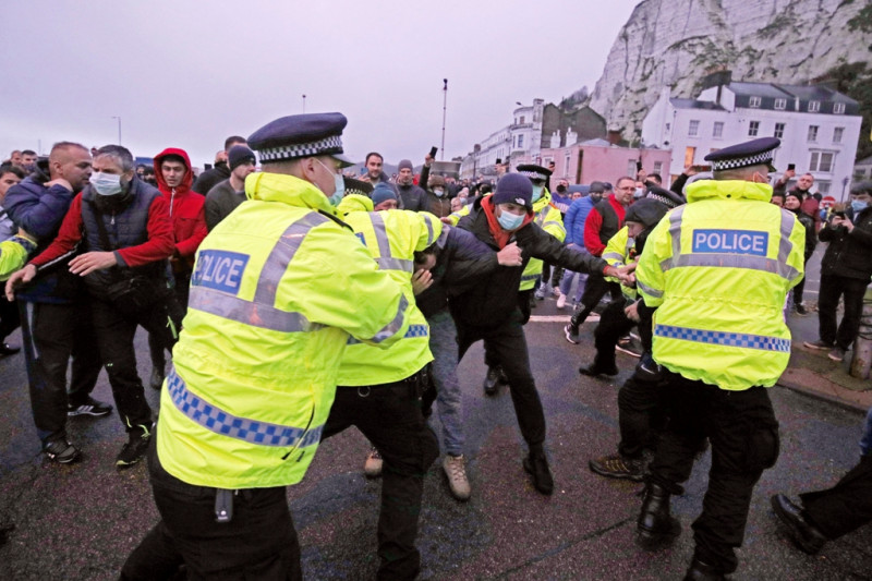 Το βίντεο που δημοσίευσε ο Guardian τραβήχτηκε το πρωί της Τετάρτης και δείχνει μια ολιγομελή ομάδα αστυνομικών να προσπαθεί να απωθήσει άνδρες στο Ντόβερ, όπου και παραμένουν μετά την απόφαση των γαλλικών αρχών να κλείσουν στα σύνορα προκειμένου να αποτρέψουν την εξάπλωση της μετάλλαξης του κορωνοϊού που έχει εμφανιστεί στο Ηνωμένο Βασίλειο.