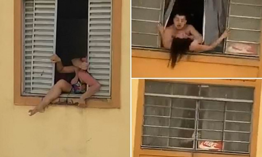 Η 35χρονη Μαρία Χοσέ αποτυπώνεται καθώς επιχειρεί να πηδήξει, ενώ ο 32χρονος σύζυγός της, Βίκτορ Μπατίστα, τη σέρνει για να μην πέσει και στη συνέχεια κλείνει και το παράθυρο.