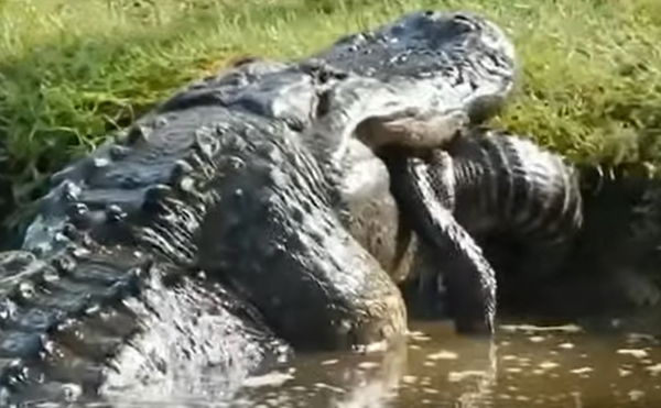 Πιο συγκεκριμένα, ο Τέιλορ Σόπερ ανήρτησε το βίντεο στον λογαριασμό του στο Twitter και στο οποίο βλέπουμε τον γιγαντιαίο αλιγάτορα να καταπίνει μέσα σε δευτερόλεπτα έναν κροκόδειλο μήκους περίπου δύο μέτρων, με τα πίσω πόδια να είναι τα μόνα που διακρίνονται να εξέχουν από το στόμα του.