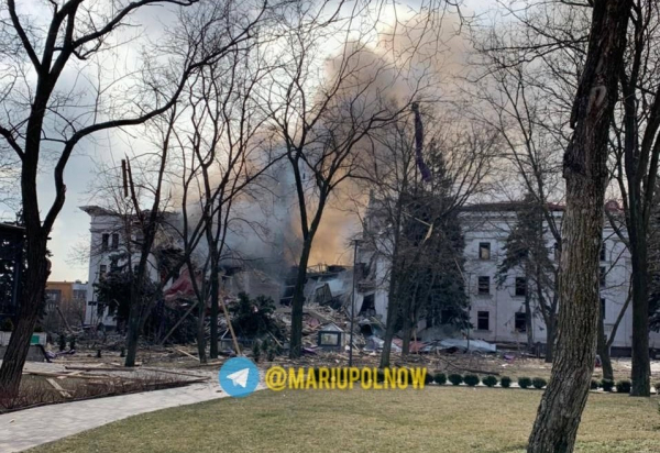 Σύμφωνα με το Ukrinform, το Δημοτικό Συμβούλιο της Μαριούπολης ανακοίνωσε στο Telegram τον βομβάρδισμο του θεάτρου στην καρδιά της πόλης.