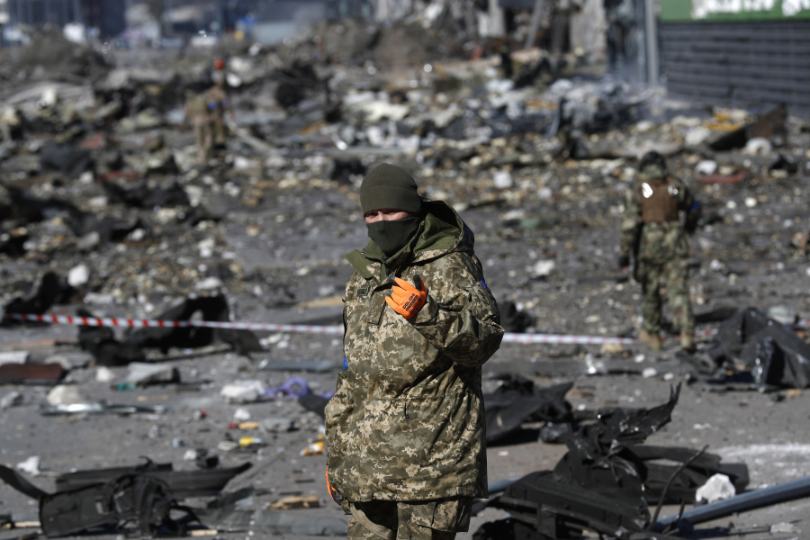Σειρήνες, βομβαρδισμοί και εκρήξεις ακούγονταν καθ’ όλη τη διάρκεια της ημέρας - τα τύμπανα του πολέμου σε μια πόλη φάντασμα, λουσμένη σε έναν σχεδόν ανοιξιάτικο ήλιο, κάτω από τις αχτίδες του οποίου λαμπυρίζουν οι χρυσοί τρούλοι του ορθόδοξου καθεδρικού ναού της Αγίας Σοφίας.