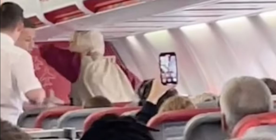 Το βίντεο δείχνει έναν άνδρα, μέλος του πληρώματος, να σκύβει σε μια σειρά καθισμάτων κοντά στο μπροστινό μέρος του αεροπλάνου και να προσπαθεί να ηρεμήσει τη γυναίκα.