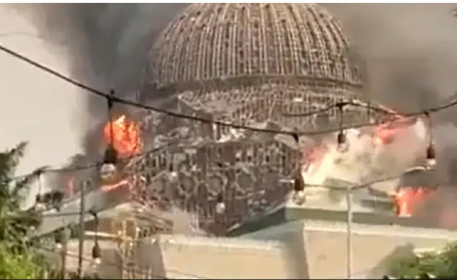 Το βίντεο δείχνει φλόγες και καπνό να φουντώνουν από τον τρούλο του τζαμιού λίγο πριν καταρρεύσει.
