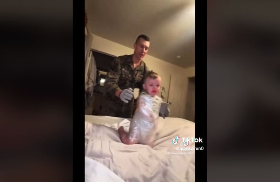 Το τρομοκρατημένο παιδί φαίνεται να κλαίει, ενώ ο πατέρας από την άλλη, που φοράει στρατιωτική στολή, γελάε. «Αν έχετε ένα γκρινιάρικο νήπιο όλη μέρα, αυτός είναι ο μόνος τρόπος», ακούγεται να λέει η μητέρα.