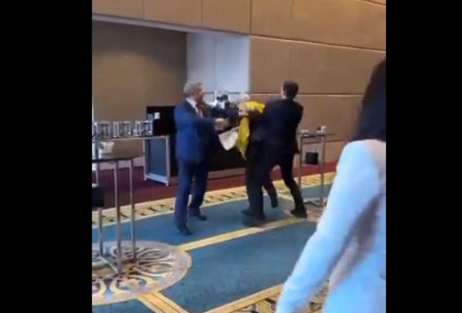 Ένας Ουκρανός χτύπησε στο πρόσωπο Ρώσο εκπρόσωπο της χώρας κατά τη διάρκεια μιας συνάντησης των χωρών της Μαύρης Θάλασσας στην τουρκική πρωτεύουσα την Πέμπτη, αφού του άρπαξαν την ουκρανική σημαία για να τον εμποδίσουν να κάνει photobombing σε μια βιντεοσκοπημένη συνέντευξη με τον επικεφαλής αντιπρόσωπο της Ρωσίας.