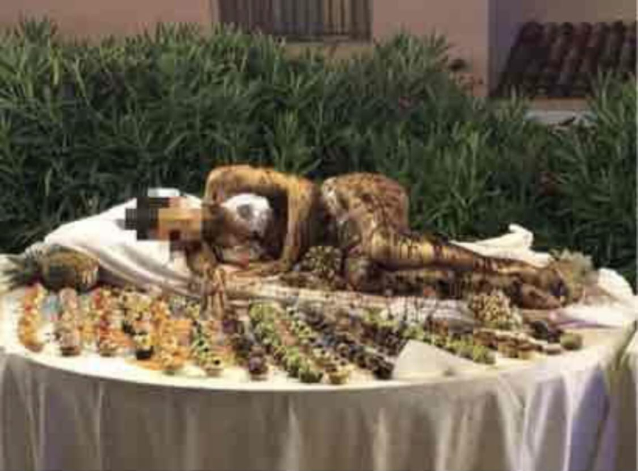 Την ανάρτηση του μάνατζερ συνοδεύει μια φωτογραφία στην οποία μπορεί κανείς να διακρίνει σε έναν μπουφέ με γλυκά του ξενοδοχείου μια ξαπλωμένη γυναίκα, το σώμα της οποίας έχει καλυφθεί με λιωμένη σοκολάτα.