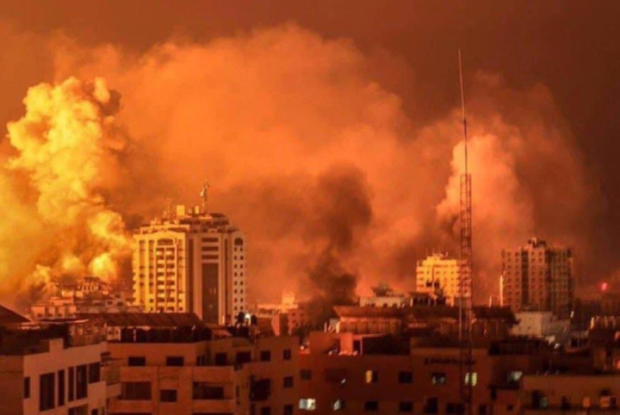 Αργά το βράδυ, ο ουρανός πάνω από τη Γάζα ήταν πορτοκαλοκόκκινος, από τις εκρήξεις και τις φωτιές που ξέσπασαν από τα ισραηλινά πλήγματα, όπως δείχνουν οι εικόνες που μεταδίδει το Γαλλικό Πρακτορείο.