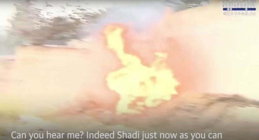 Στο βίντεο που έδωσε στη δημοσιότητα το Guardian, η δημοσιογράφος Ριφ Ακίλ δίνει live το ρεπορτάζ της στο Al Jadeed από την περιοχή Γιαρούν κοντά στα σύνορα με το Ισραήλ.