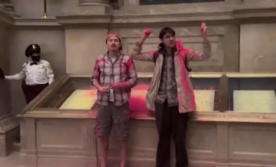 Βίντεο που αναρτήθηκαν σε ιστοτόπους κοινωνικής δικτύωσης δείχνουν δύο άνδρες να στέκουν δίπλα στις προθήκες, με τα χέρια και τα ρούχα τους καλυμμένα από μια ροζ σκόνη. Παραφράζοντας το Σύνταγμα, είπαν στους επισκέπτες του μουσείου ότι πιστεύουν πως όλοι στον πλανήτη έχουν δικαίωμα στον καθαρό αέρα και το βιώσιμο κλίμα και ζήτησαν από τον πρόεδρο των ΗΠΑ Τζο Μπάιντεν να κηρύξει κατάσταση έκτακτης κλιματικής ανάγκης.