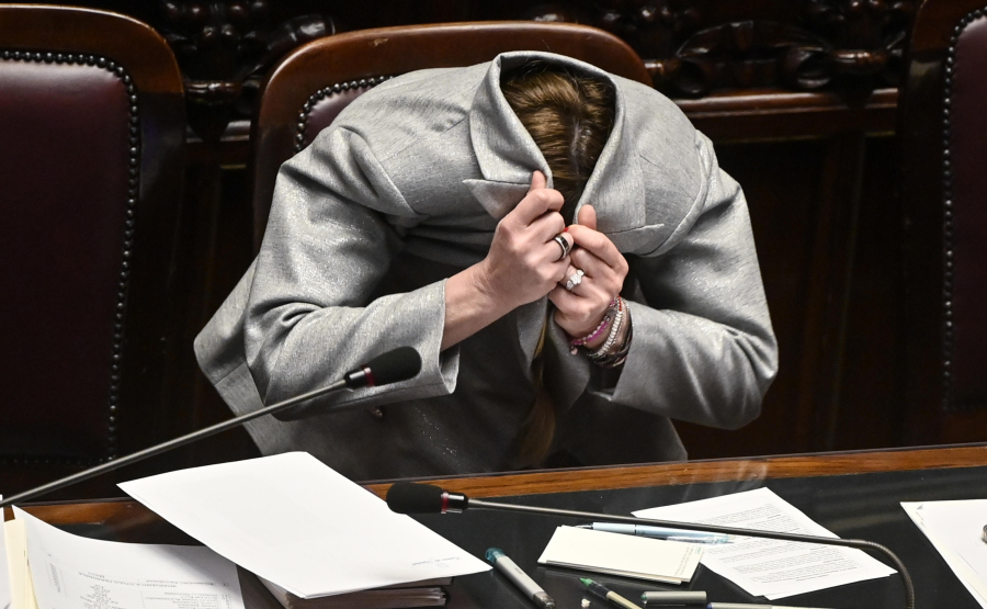 Η Ιταλίδα πρωθυπουργός αντέδρασε με μια θεατρική κίνηση: άνοιξε διάπλατα τα χέρια της και στη συνέχεια έκρυψε το κεφάλι της μέσα στο σακάκι της, στιγμιότυπο που κατέγραψαν οι φωτογράφοι.