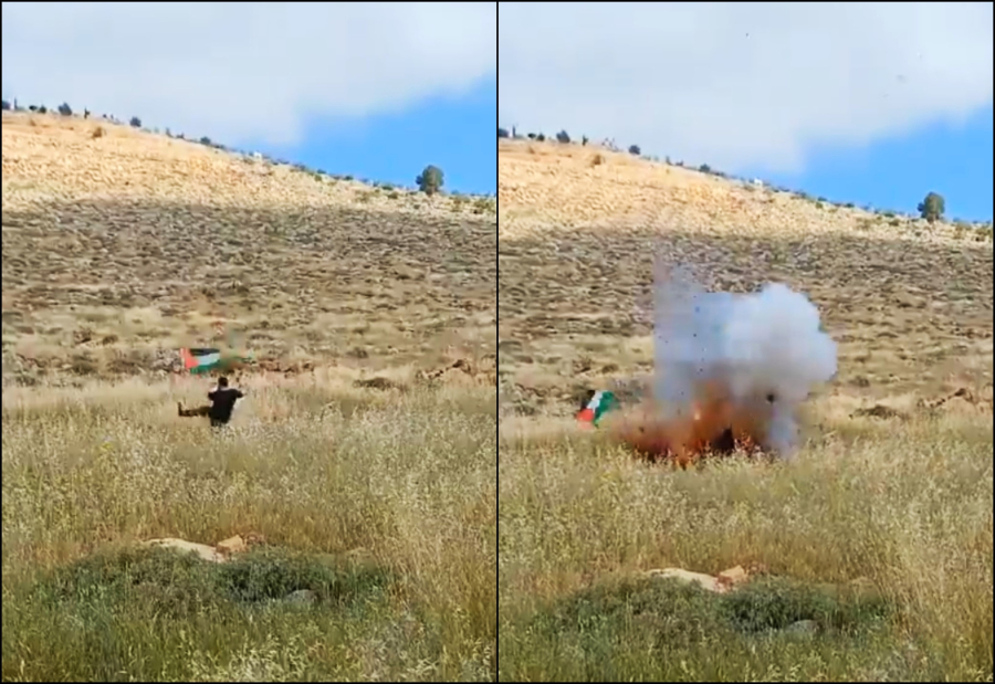 Όπως φαίνεται και στο βίντεο, ο άνδρας προσπάθησε να αφαιρέσει μια παλαιστινιακή σημαία κλωτσόντας την στο πλάι επαρχιακής οδού όταν εξερράγη ο μηχανισμός.